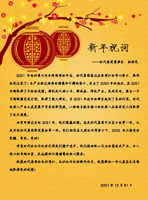 【概要描述】2021年面對國內外各種困難的沖擊,時代集團通過全體同仁的齊心努力,勝利的走過來了1各產業經過艱難的調整和不懈的努力,走出了2020年的低谷,在2021年都取得了不俗的成績。特別是之峰公司、新試金、焊機產業、瓜州風電,最后一個月都超額完成計劃